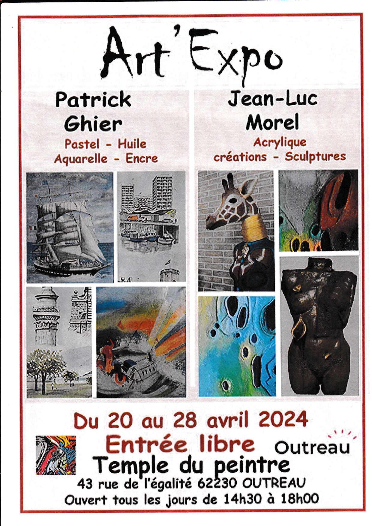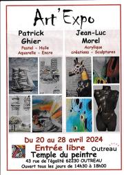 Du 20 au 28 Avril, tous les jours de 14h à18h ,Patrick GHIER et Jean-Luc MOREL accueilleront le public au Temple du peintre, 43 rue de l'Egalité à OUTREAU où ils exposeront quelques-unes de leurs œuvres.