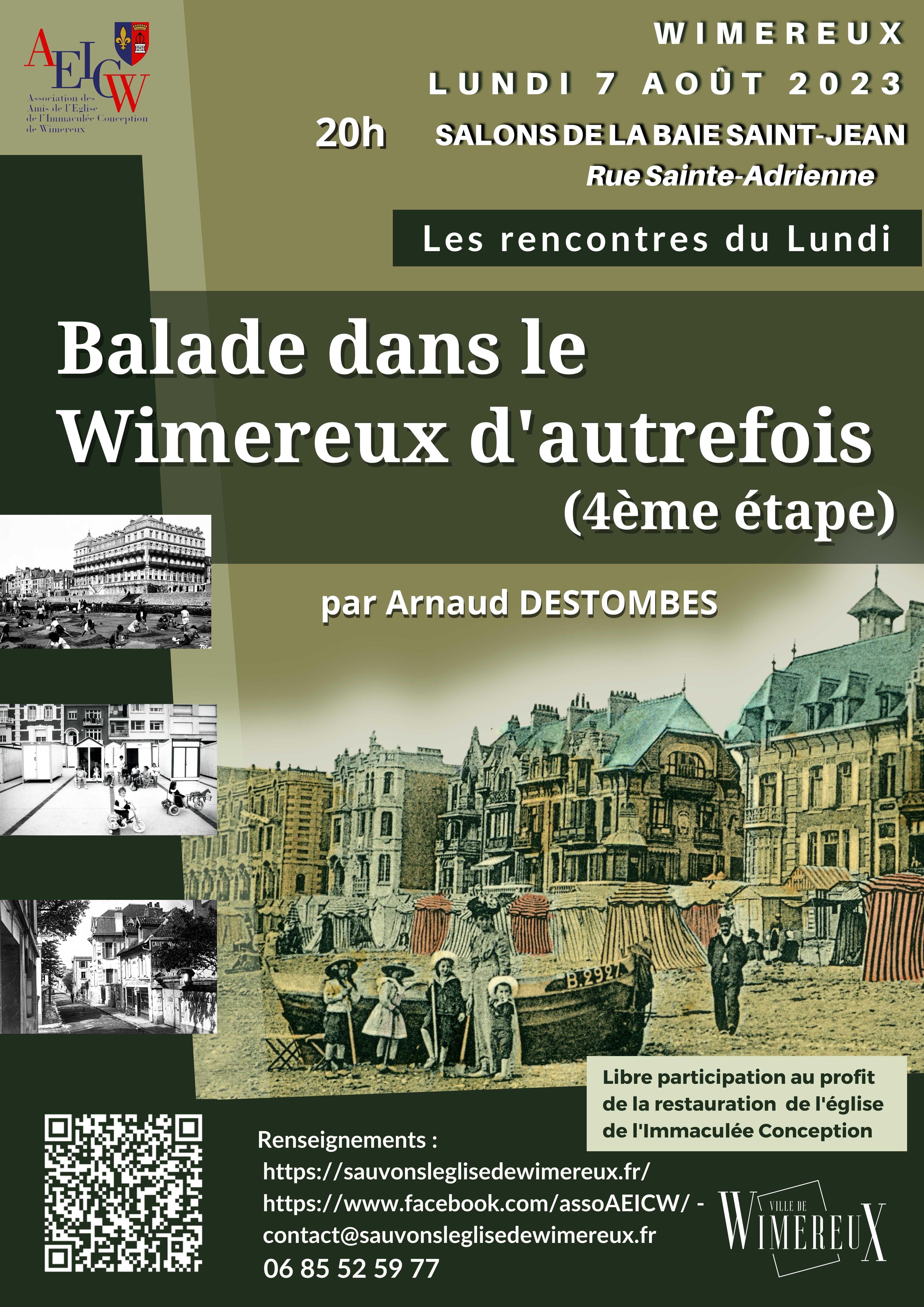 Arnaud Destombes est passionné par l'histoire de Wimereux qu'il décrypte à travers une collection de cartes postales abondante, depuis les origines de la ville, et enrichie par des photos de famille qui lui sont amicalement confiées. A partir de ces supports visuels, parfois uniques sur plaques de verre, et le recueil d'une belle documentation dans les archives, il prend plaisir à nous faire remonter le temps, agrémentant le commentaire de chaque photo par des témoignages et anecdotes. Lors de ce quatrième volet de ses balades wimereusiennes, il ne manquera pas de nous surprendre une nouvelle fois !