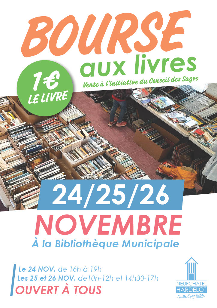 Bourse aux livres à la Bibliothèque municipale. Le vendredi de 16h à 19h ; le samedi et dimanche de 10h à 12h et de 14h30 à 17h. ouvert à tous. 1€ le livre. www.villeneufchatel-hardelot.fr Organisé par la ville de Neufchâtel-Hardelot, à l'initiative du Conseil des sages