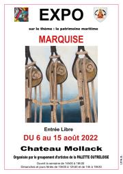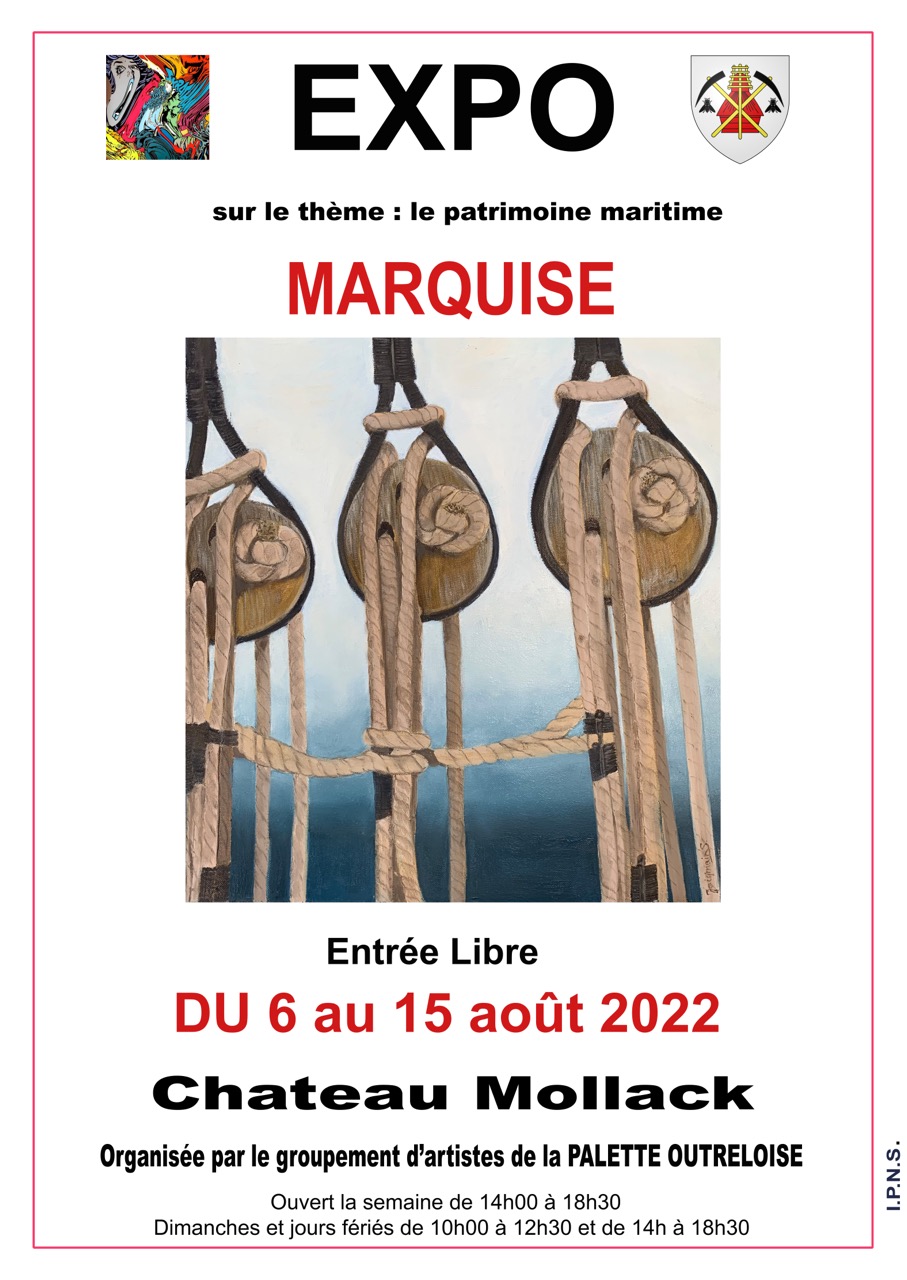 Notre groupement d'Artistes exposera du 6 au 15 août 2022 dans ce beau lieu chargé d'Histoire qu'est le "Château Mollack "à Marquise (près de la Caserne des Pompiers). Certains artistes auront travaillé sur le Patrimoine maritime. Ils accueilleront le public tous les jours: en semaine de14h à 18h30 et Dimanches et jour férié de 10h à 12h30 et de 14h à 18h30