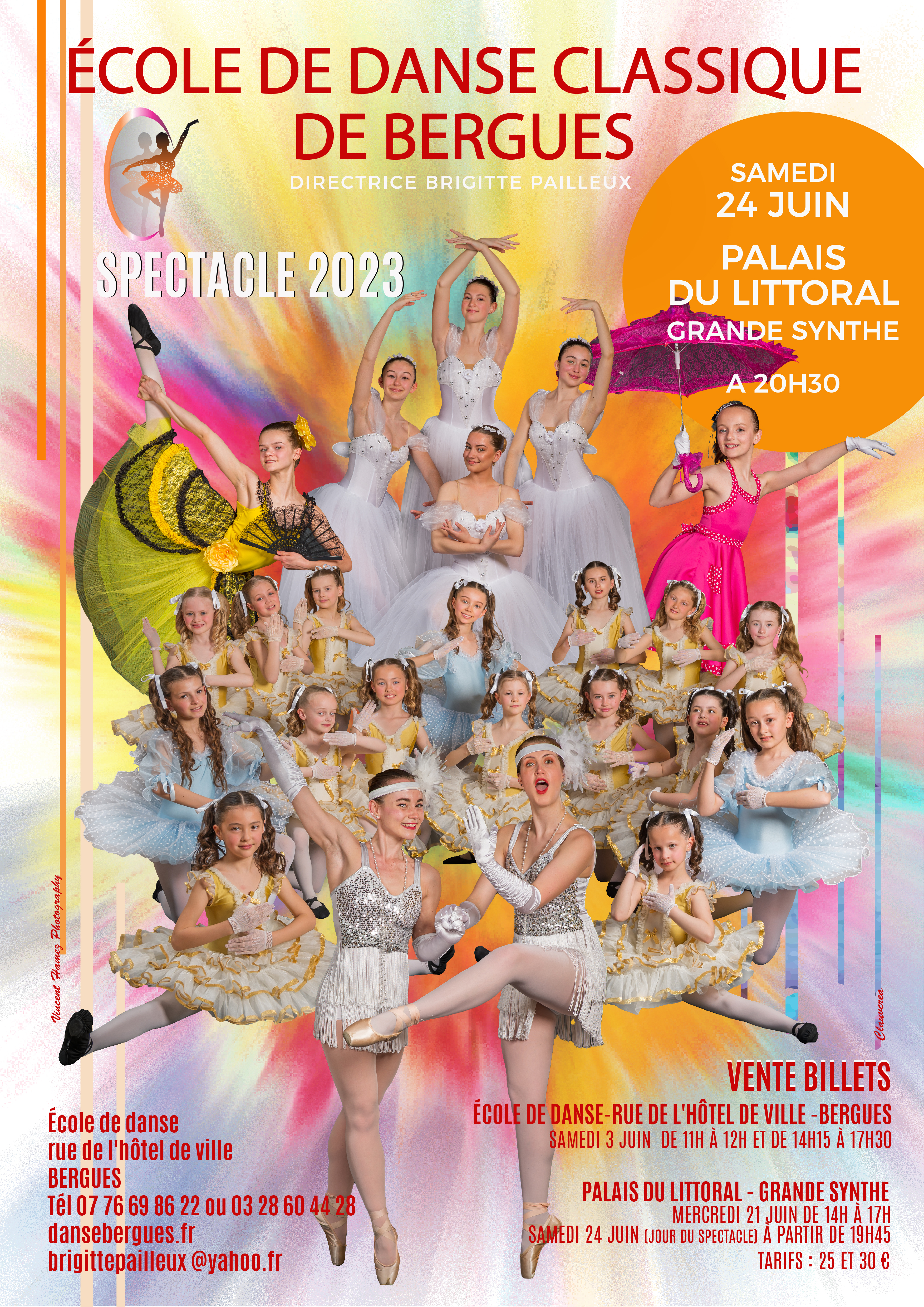 "Le samedi 24 juin 2023, à 20h30, au Palais du Littoral à Grande Synthe, Brigitte Pailleux directrice de l'école de danse classique de Bergues présentera son spectacle 2023.Du classique, bien sûr, mais également beaucoup de fantaisie tout public où chacun trouvera son bonheur !