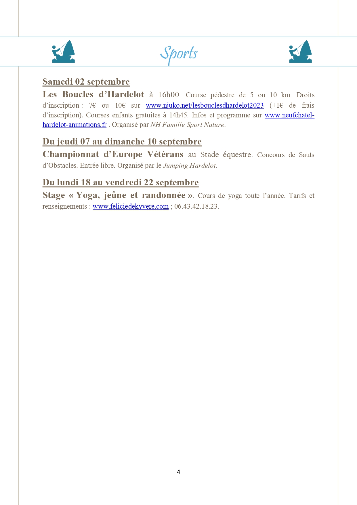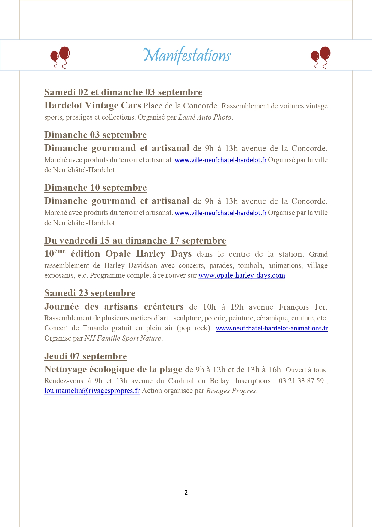Vous pouvez trouver ci-joint le programme des animations de septembre dans la station. Au programme, de beaux événements tels que Les Boucles d'Hardelot, Opale Harley Days ou encore La Journée des Artisans Créateurs.