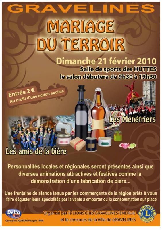 Le LIONS CLUB GRAVELINES ENERGIE, avec le concours de la ville de Gravelines, organise le 1er Salon «Mariage du Terroir ». Ce salon a pour objectif de faire découvrir les spécialités et les savoirfaire locaux et régionaux, grâce à la diversité des exposants et producteurs présents. Plus de 30 professionnels présenteront leurs produits du terroir ; du sucré au salé, des douceurs, des parfums… Un véritable tour de France des saveurs sera possible grâce à la présentation et surtout la dégustation de nombreux produits de nos régions ! Une mise en bouche : bière, perlé de groseille, café, vins, chocolat, vêtements pour enfant, objets de décoration, linge de maison… De nombreuses animations au programme : démonstration de dentelle, fabrication de bière, exposition de peintures … Les amis de la bière et les Ménétriers seront présents sur le salon.