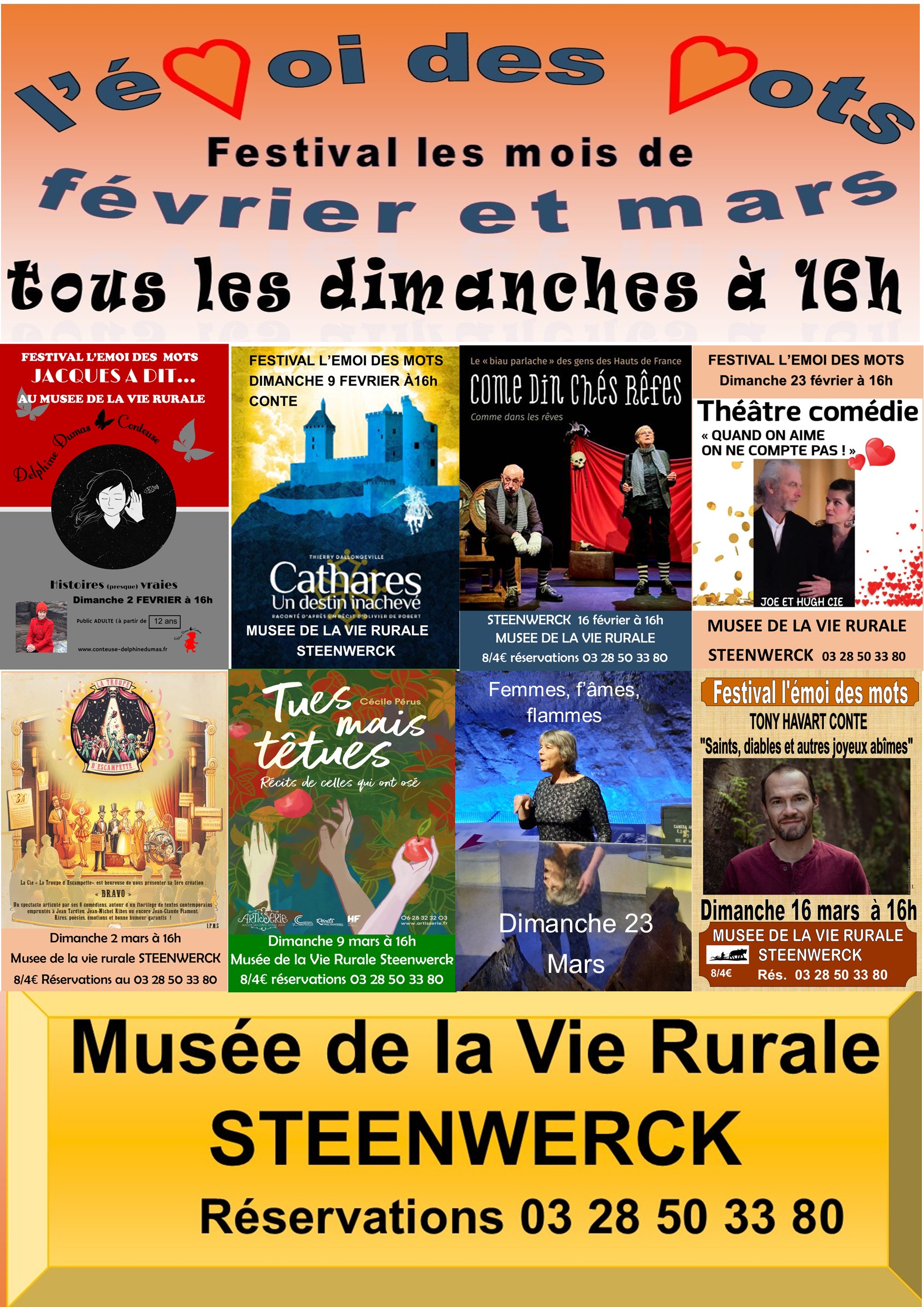Chaque dimanche des mois de février et mars à 16heures, nous vous donnons rendez-vous pour savourer les mots au travers de récits, de contes, d'histoires, conférence, poésie et théâtre, dans un programme varié où vous puiserez selon vos goûts et intérêts. Nous y ajoutons également les dates des veillées contes des premiers vendredis de chaque mois.