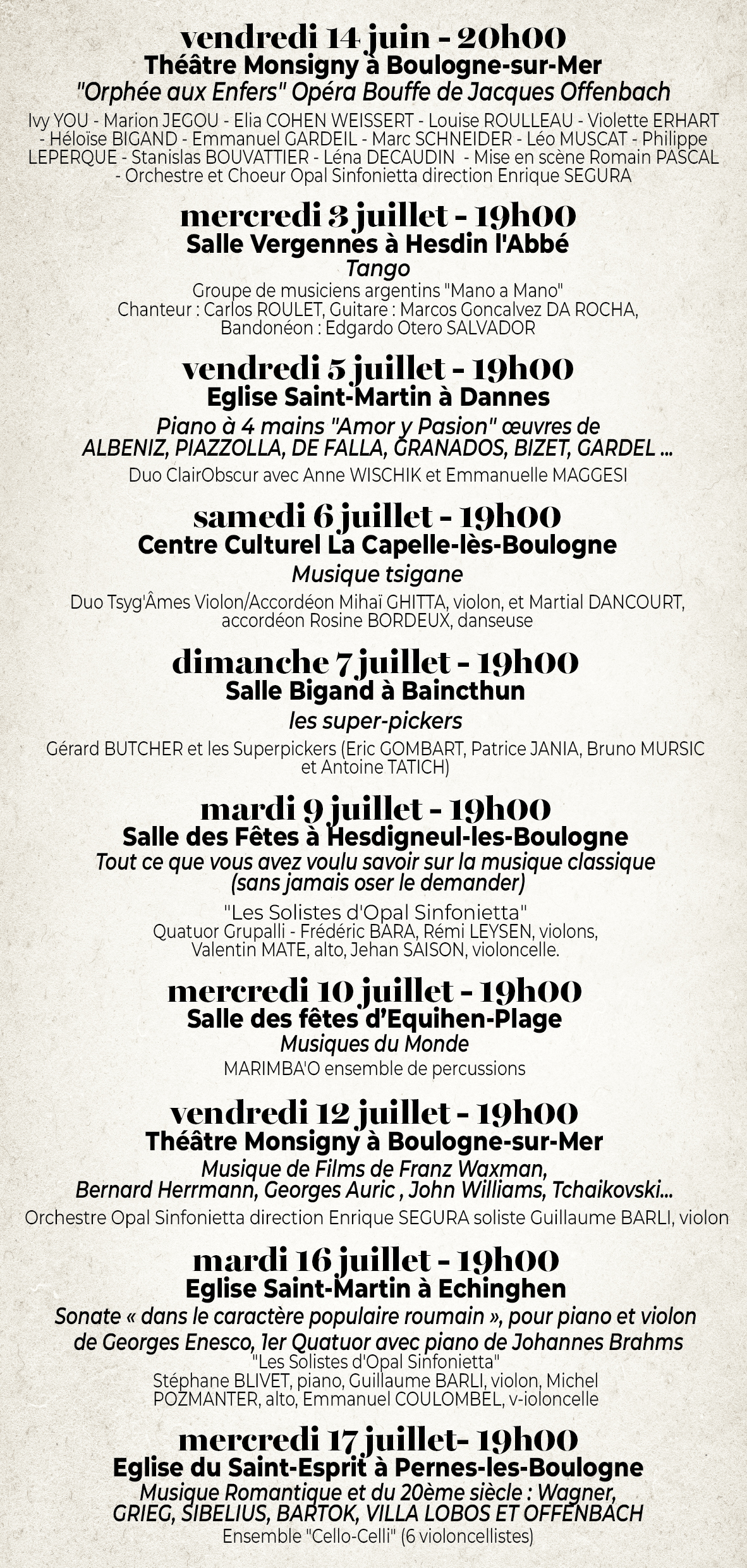 Quand bien même on ne parlerait pas sa langue, Shakespeare n'appartient pas qu'aux anglais, et, pour cette 13ème édition des Nocturnes d'Opale, nous avons fait nôtre cette pensée du poète dramaturge. « Le monde entier est un théâtre, et tous hommes et femmes, n'en sont que les acteurs... » Notre rôle a été de réunir des acteurs, artistes musiciens bien sûr, et du monde entier ? Non peut-être pas, mais quand même ! Fidèles à sa démarche, le festival des Nocturnes d'Opale offre un éventail de musiques internationales, voire intercontinentales et intemporelles.