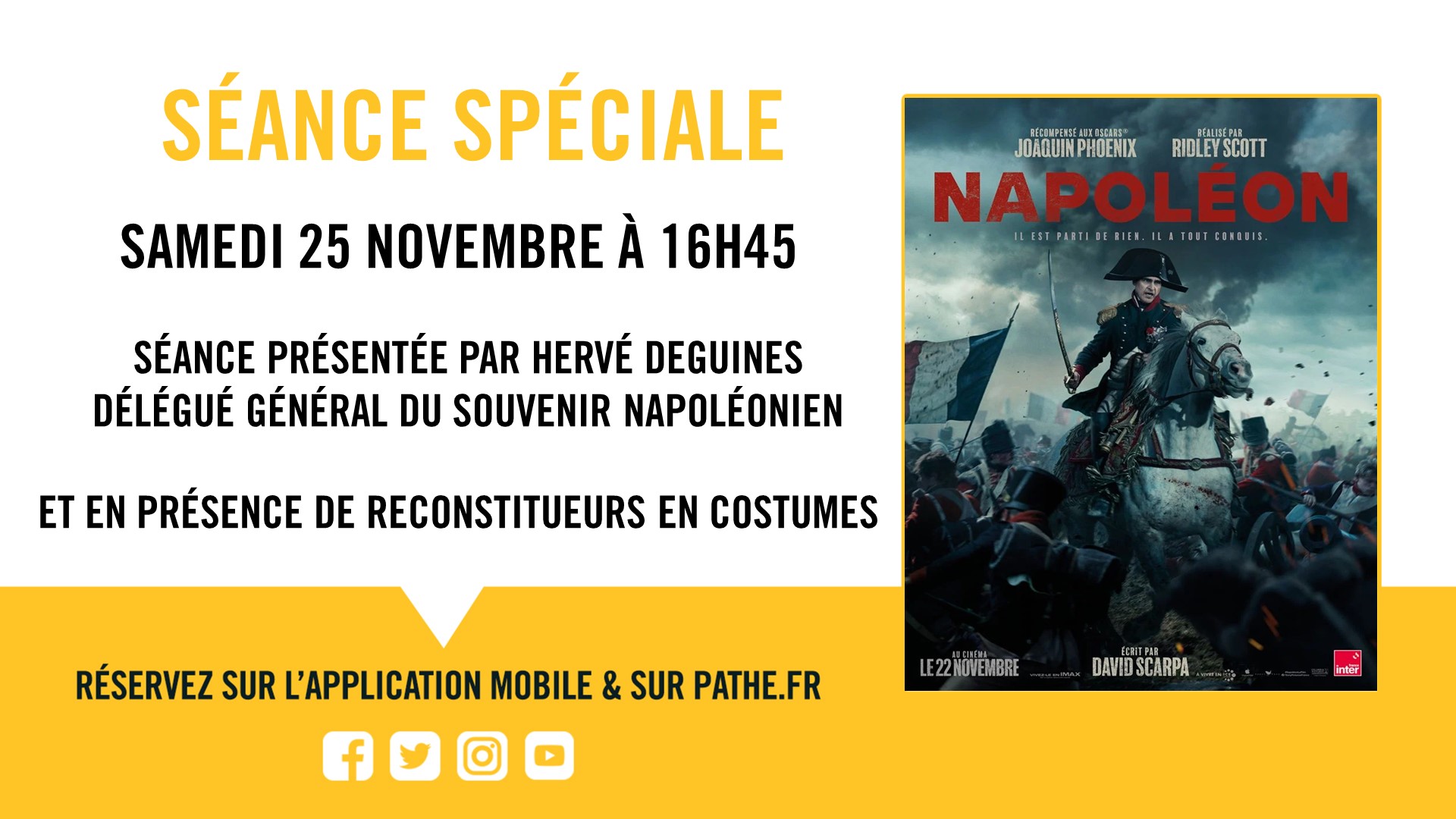 Le Pathé Cité Europe est heureuse d'accueillir le délégué régional du souvenir Napoléonien, Hervé Deguines, accompagné de nombreux reconstitueurs en costumes pour une séance spéciale du film événement « Napoléon » le samedi 25 novembre à 16h45.