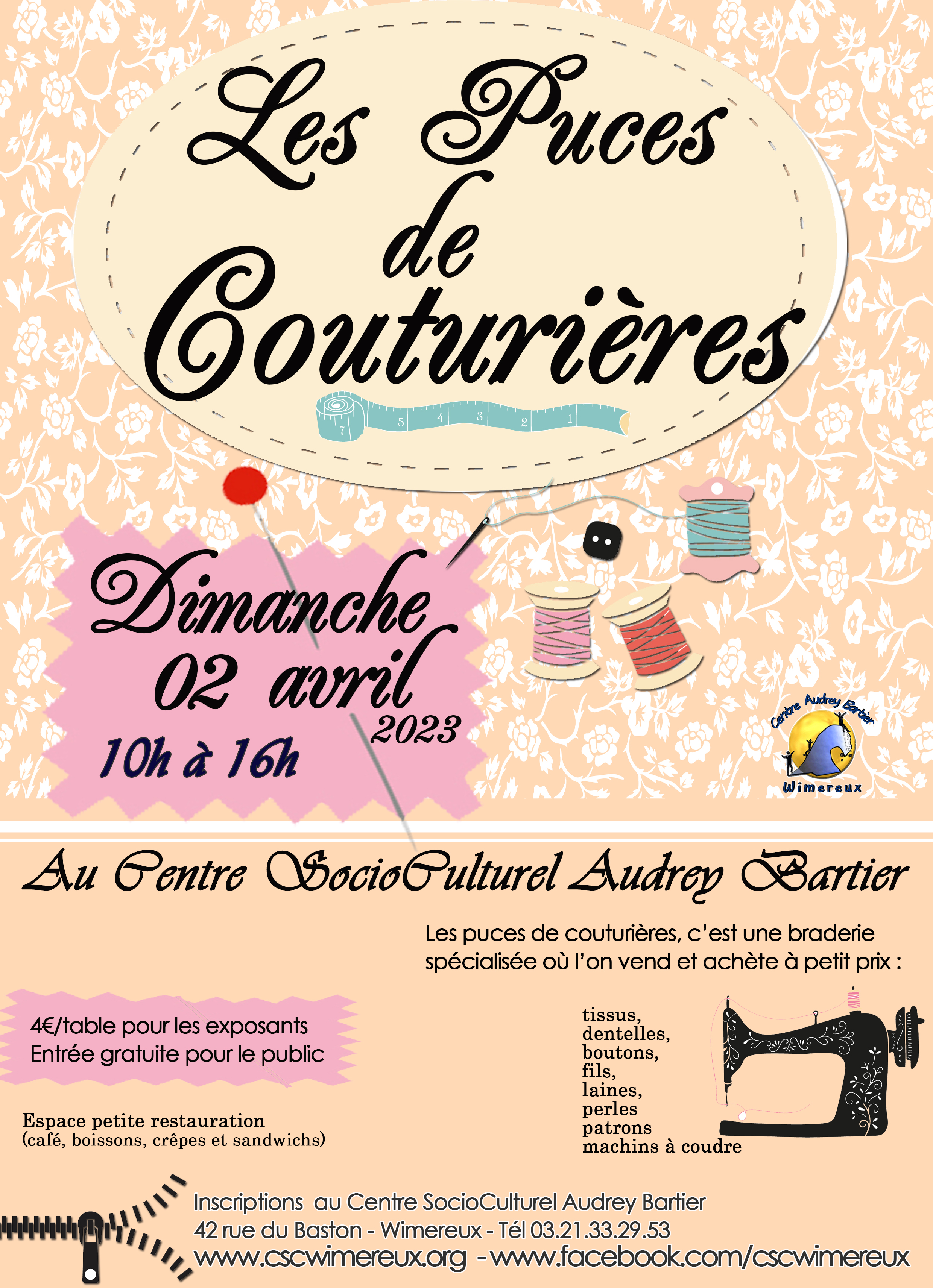 (Les puces de couturières, c'est une braderie où l'on vend et achète à petit prix. ex. : tissus, laines, machines à coudre, perles.....)