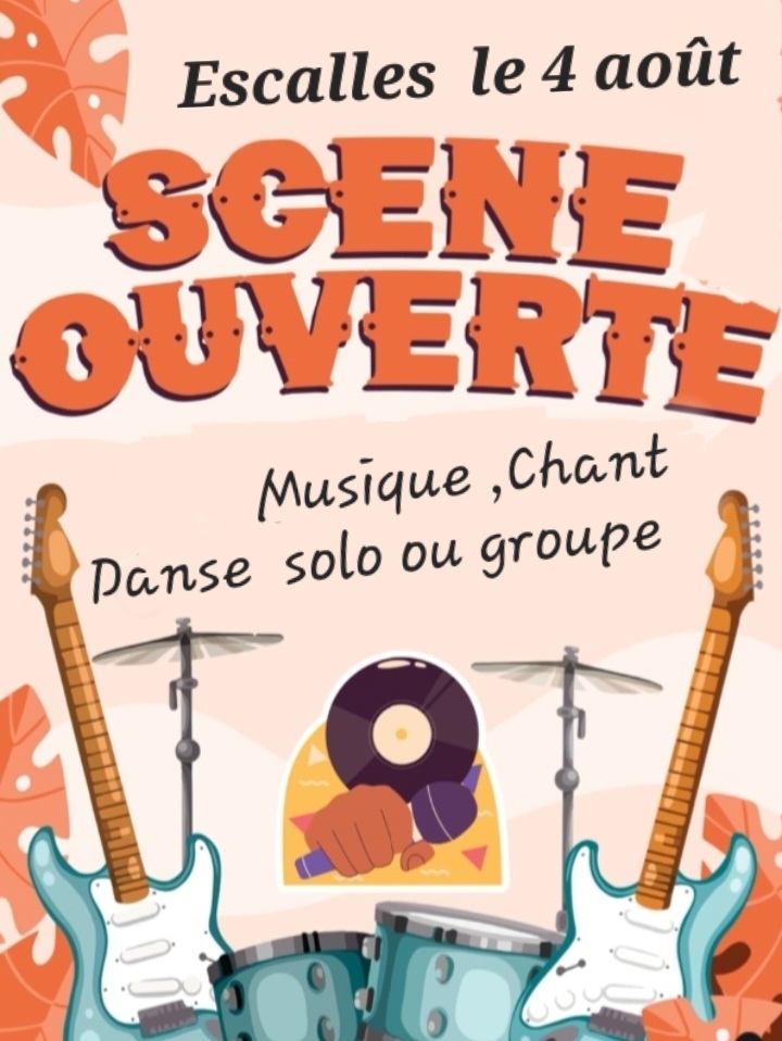 Le dimanche 4 août 2024, à l'occasion du marché du terroir et de l'artisanat d'Escalles, le comité des fêtes propose une scène ouverte à toutes et à tous : Jouer un morceau de guitare, interpréter une chanson, monter un groupe, faire une représentation de danse... Vous avez carte blanche ! Vous êtes libre d'exprimer votre fibre artistique comme vous le souhaitez. Podium et sono seront à disposition pour votre prestation.