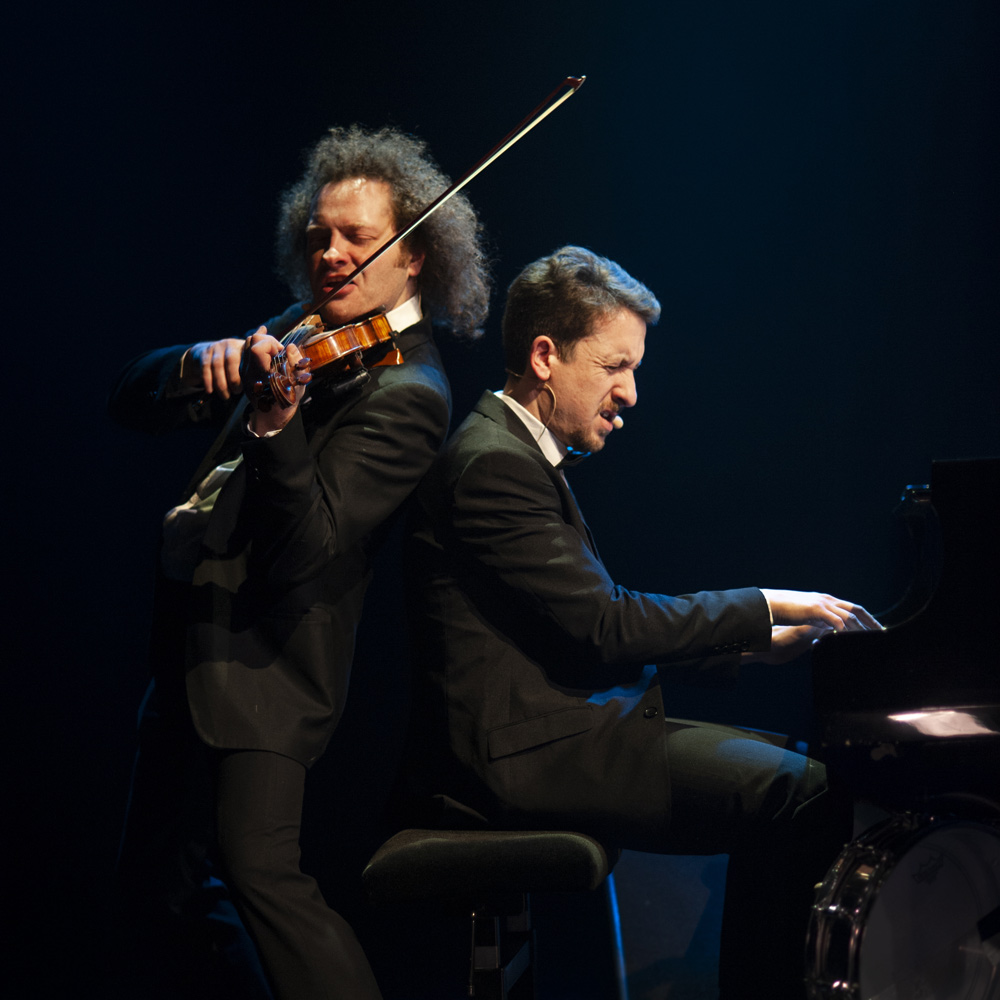 Le violoniste, polymorphe vocal et son acolyte pianiste d'une verve comique irrésistible, vous emmènent dans leurs différents univers musicaux, sur un rythme effréné, avec humour et folie. Un cartoon mélodieux et hilarant où l'absurde n'a d'égal que la virtuosité. Une pincée d'ACDC, un soupçon de Stevie Wonder et un zeste de Rolling Stones ; le tout mélangé dans un wok musical relevé d'une sauce Bach et Tchaïkovski et on obtient le wok'n'woll