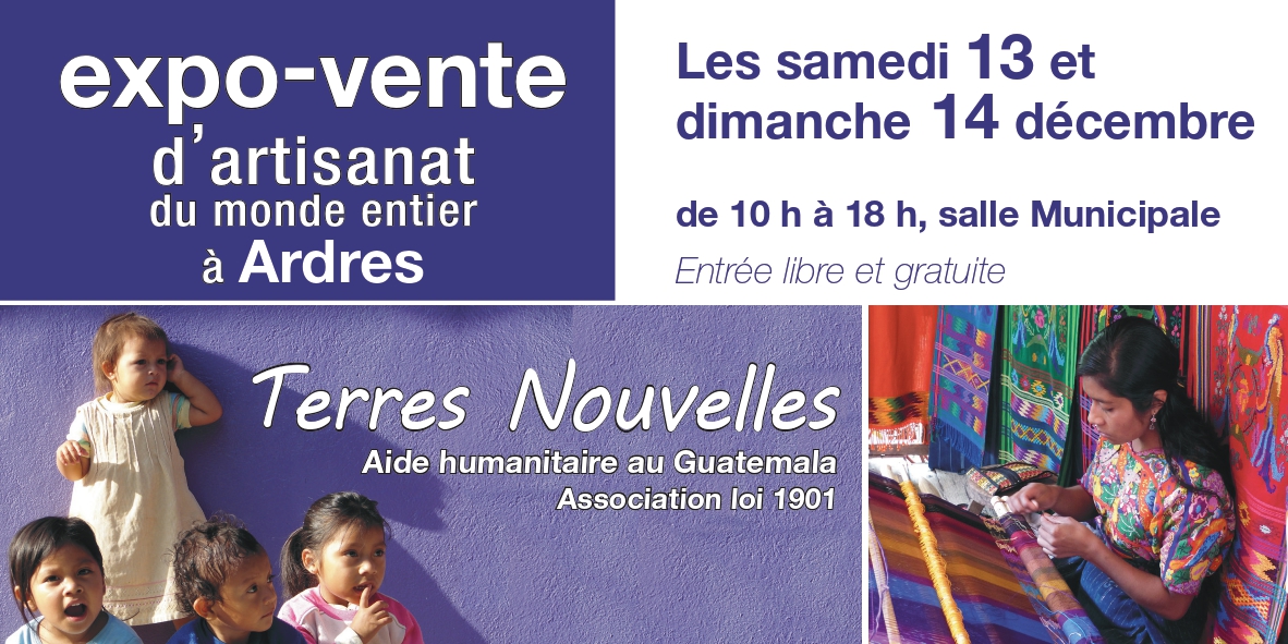 Les expositions-ventes d'artisanat des pays du bout du monde, c'est comme un rituel pour Terres Nouvelles : chaque année sont organisées 4 manifestations de ce genre, dans le Pas de Calais (Sangatte, Saint-Martin-Lez-Tatinghem et Ardres) et dans l'Aisne (Saint-Quentin). Cette fois l'association investit pendant deux jours la Salle Municipale à Ardres.