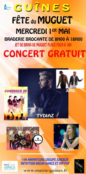 À partir de 18h, c'est le jet des brins de muguet et un concert gratuit avec : MEGAN, COMEBACK 80, KLA, les JUMO et TYDIAZ.