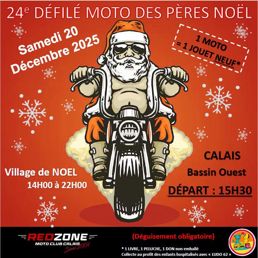 Comme chaque année depuis plus de 20ans, grande parade des pères Noël à moto sur Calais, organisé par le Moto Club RedZone de Calais.