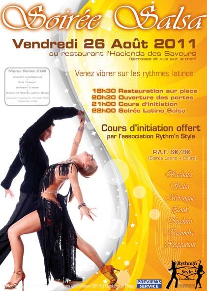 Vendredi 22 Août 2011 de 20h30 à 02H00 Lieu : Restaurant l'hacienda des Saveurs - 6/7 digue des alliés - 59140 Dunkerque Plage sur la digue de mer Réservation Hacienda Tél : 03.28.60.18.66 Restauration Limitée Entrée 6€/8€ adhérents/extérieurs (Soirée Latino + Cours)